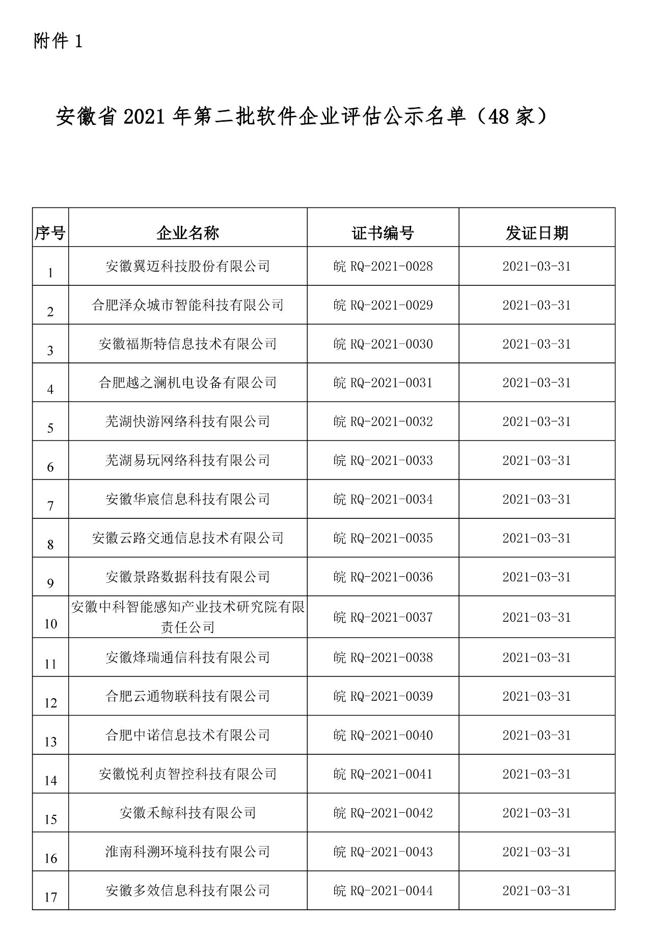 根据《进一步鼓励软件产业和集成电路产业开展的若干政策》(国发〔2011〕4 号)、软件企业评估规范 AHSIAB 001-2016》和《软件产品评估规范 AHSIAB 002-2016》,2021年3月,经安徽省软件行业协会专家评审组审核,同意“安徽翼迈科技股份有限公司”等48家企业评估为软件企业(见附件一);“美关公智慧眼住户安全守护系统V1.0”等80件产品评估为软件产品(见附件二)。现将安徽省2021年第二批软件企业/产品评估结果予以公示: