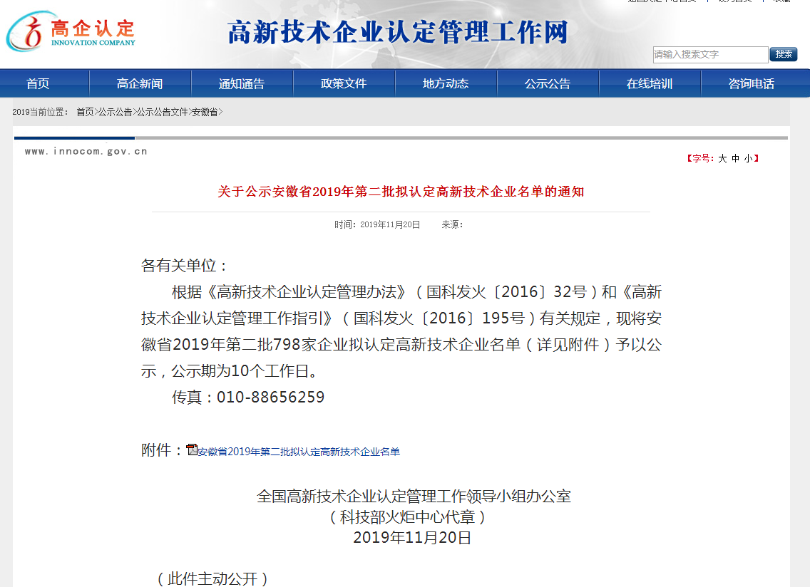 2019年11月20日,国家科研技术部火炬中心发布了《关于公示安徽省2019年第二批拟认定高新技术企业名单的通知》,安徽M6米乐 M6 机电科技开展有限公司迁址合肥市经开区后,继续被认定为高新技术企业!