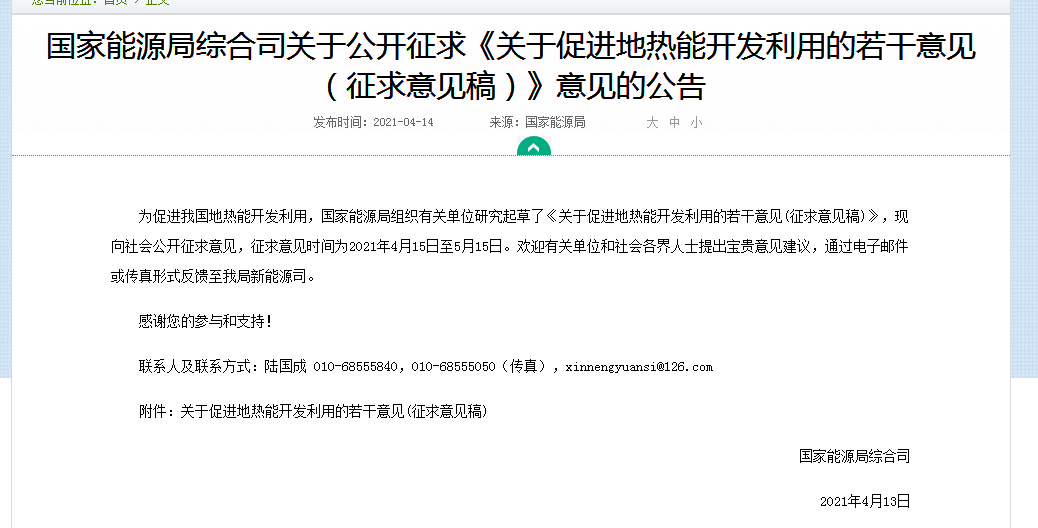 国家能源局综合司关于公开征求《关于促进地热能开发利用的若干意见(征求意见稿)》意见的公告